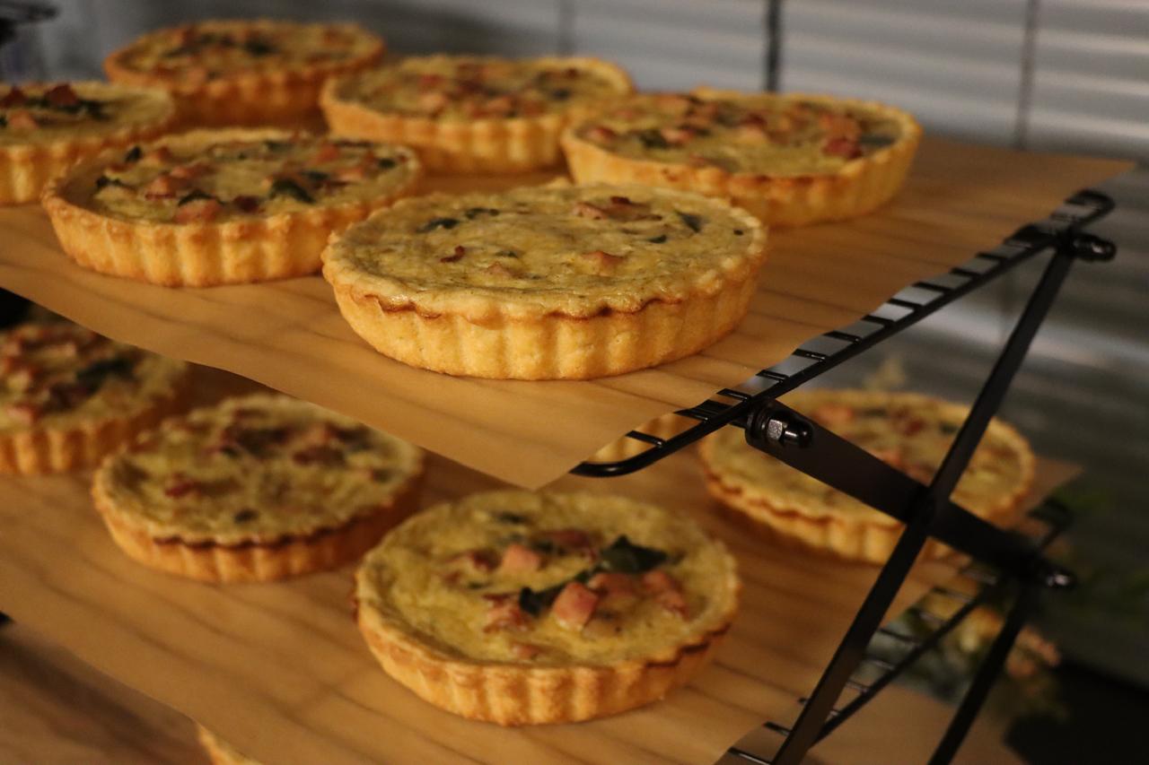 Tarta salada rellena de jamón, tocino, cebolla y un toque de chile poblano.